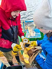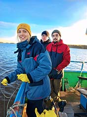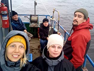 Сотрудники лаборатории гидробиологии Даниил Коновалов, Ксения Исакова и Анна Ефимова отбирали пробы воды для определения хлорофилла «а», фито- и бактериопланктона, зоопланктона и макрозообентоса.